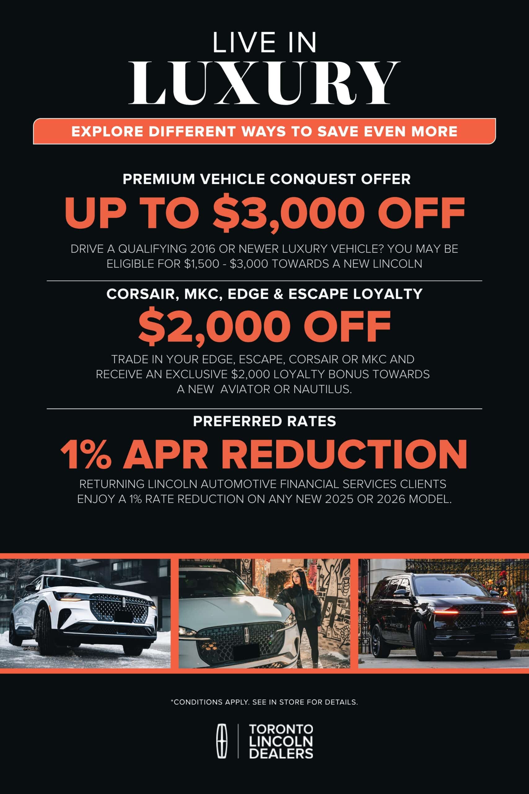 Browse the full Lincoln lineup, featuring luxury SUVs designed for superior comfort, cutting-edge technology, and unparalleled performance. Whether you’re looking for the Lincoln Corsair, Nautilus, Aviator, or Navigator, you can connect with the right dealership to meet your needs. Shopping for a Lincoln in Toronto has never been easier.